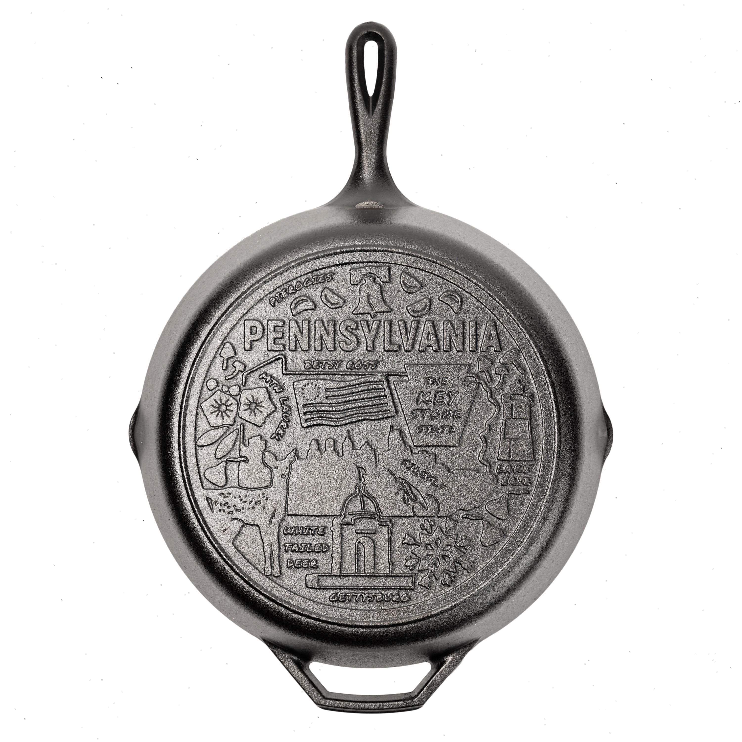 Celebrate the “Key Stone State” with a special edition Pennsylvania skillet! This pan is part of our American Road Trip series, and takes you on a tour of your favorite states. We spy favorite snacks, including pierogies and Hershey’s Kisses; plus beloved creatures, like the white-tailed deer and firefly. Look closely and you’ll also see some of the state’s most enduring historic icons, including the Betsy Ross flag, Liberty Bell, and Pennsylvania Dutch art.